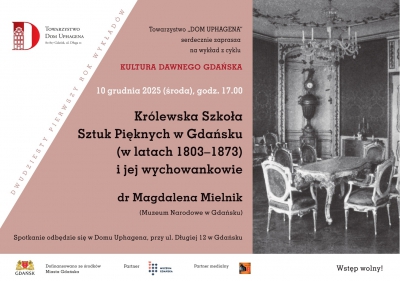 Wykład w Domu Uphagena Towarzystwo Dom Uphagena zaprasza serdecznie w środę, 10 grudnia 2025 o godzinie 17.00 na wykład z 21. cyklu „Kultura Dawnego Gdańska”. Dr Magdalena Mielnik (Muzeum Narodowe w Gdańsku) wygłosi prelekcję na temat: Królewska Szkoła Sztuk Pięknych w Gdańsku 1803-1893 i jej wychowankowie. Wykład odbędzie się w siedzibie Towarzystwa: Dom Uphagena, Oddział Muzeum Gdańska, ul. Długa 12. Wśród słuchaczy jak zwykle rozlosujemy ... więcej »Kreatywna twórczość
